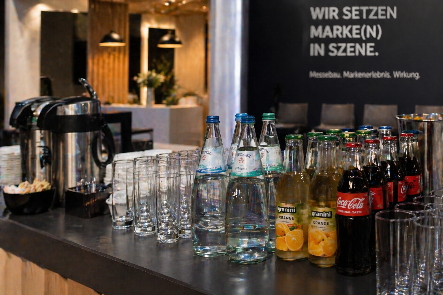 Und damit Sie nicht selbst den Kochlöffel schwingen müssen: Küche, Kühlschrank, Schankanlage & Co. stehen bei Ankunft fix und fertig auf Ihrem Messestand.
